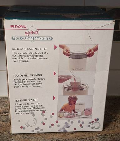 Rival Soft Serve Ice Cream Machine (Model 8150) for Sale in Newark/New Castle area. Works great and comes with the original box, manual, and spatula. Makes soft serve ice cream, frozen yogurt,...