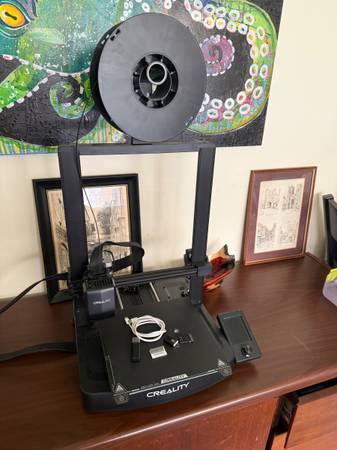 Barely used Creality Ender 3d SE v3. Perfect condition. Turns out I'm just not a 3d-printing kind of guy. $200. Fully assembled and ready to go. I'm not disassembling and shipping it. Venmo or CashApp preferred. Cash is fine, too. Available in North Wilmington near the Concord Mall. I think I have a full spool of blue filament, and the black filament shown in the pics. It's not anything fancy, just basic filament. Included.