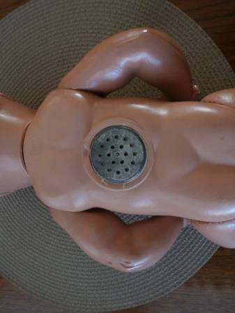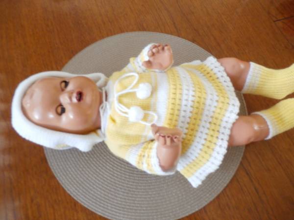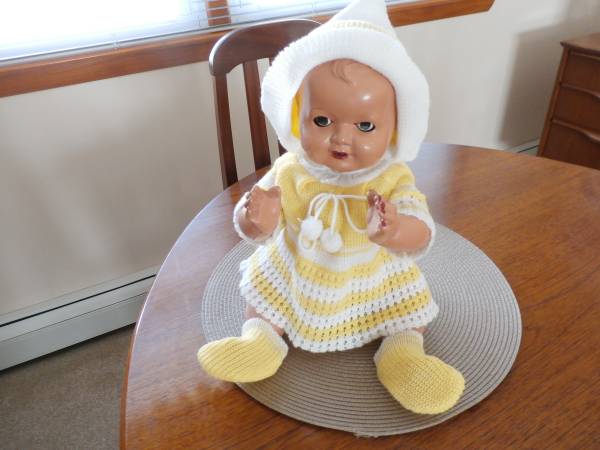 Antique doll from the 1940-50's. "Annie" (my name for her, is 17 1/2" and her blue eyes open and close. Unfortunately she no longer says MaMa. There is a circle on her back with Made in England and 45 stamped in the middle. There is also a word printed above which starts PLA---- Cannot make out the rest. The clothes she is wearing is from a later date. There are some rub marks on her due to age.