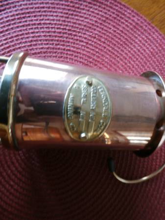2 Miners Lamps from Wales, UK. Reproductions in brass and copper. 9 1/2" tall inc. hook $75.00 and the larger in copper and brass made by the Ferndale Coal and Mining Company in Wales. Size is 12" inc. hook. Very rare.Same as used in the passing of the Olympic Flame from Paris to LA.
