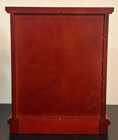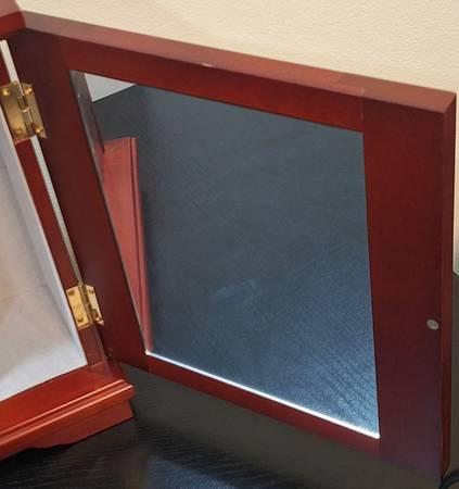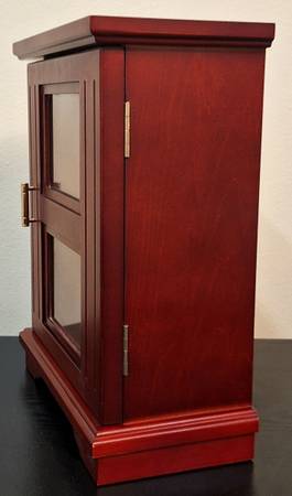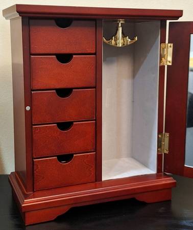 Beautiful, well-made wooden jewelry box featuring two front picture frames, five removable drawers with soft velvet-style lining, and a side compartment with necklace hooks.
