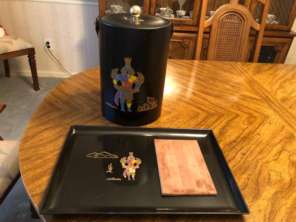 Vintage Couroc of Monterey, California Cheese Tray 10-1/2 x 15 with wood cutting board. Matching ice bucket. The motif is of a Kachina warrior. The cheese tray is lacquered. The exterior of the ice...