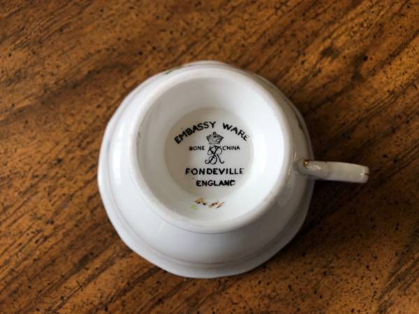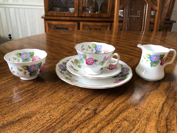 Rare find. Vintage Embassy Ware “Morning Glory” Bone China Fondeville England. 7 cups, 7 saucers, 7 dessert plates, and sugar and creamer. Cups, saucers, and dessert plates are gold rimmed. 6 additional pieces. 29 pieces total. Perfect condition. No chips, cracks, or signs of wear.