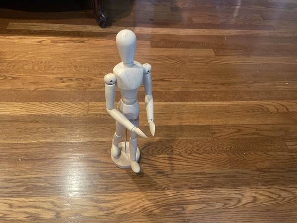 Adjustable wooden mannequin figure with base — perfect for sketching, art practice, or as a decorative piece. Fully poseable joints Comes with stand for stability Condition: gently used, like new...