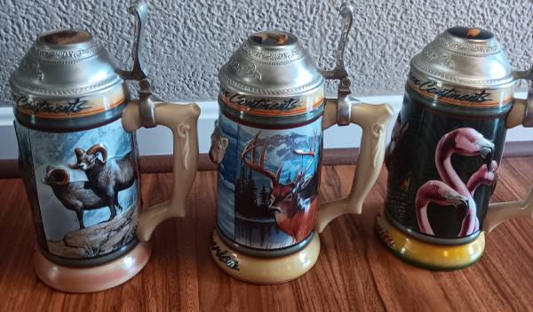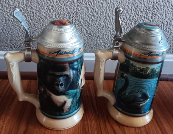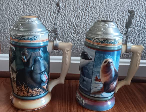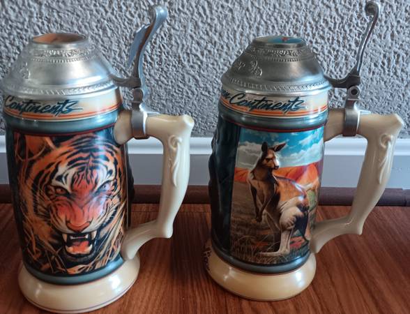 $250 for ALL seven of the collectible steins. Can not sell individually. Each stein has four picture animals. Three on each side and one on top of stein. Part of the handle has an outline of the continent. Height measures 10 1/2". Smoke-free home.