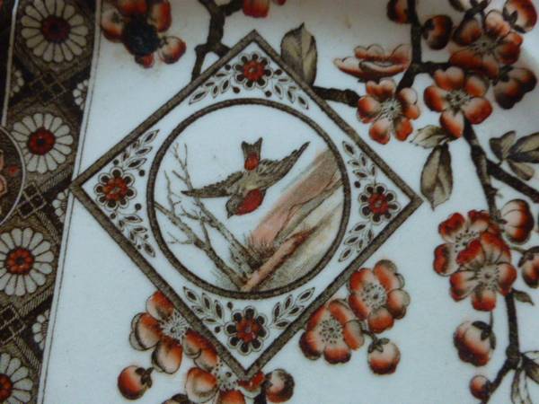 This is a gorgeous antique brown transfer earthenware plate made in Stoke-on-Trent, England by Ridgways Pottery c. 1879-1890, in their "DADO" pattern that was influenced by Japanese art, it features a bird flying over a lake with mountains in the background, cherries on branches and cherry blossoms on a branch. The backside is stamped under the glaze in brown, DADO - and the company's mark, the bow and arrows in the quiver with RIDGWAYS written on the side - Stoke On Trent. In excellent condition. There are no chips, cracks, repairs or stains. Wear is consistent with age and use, there is light overall crazing. Please view all photos to appreciate the beauty, quality and condition of the piece, as my photos are part of the description.