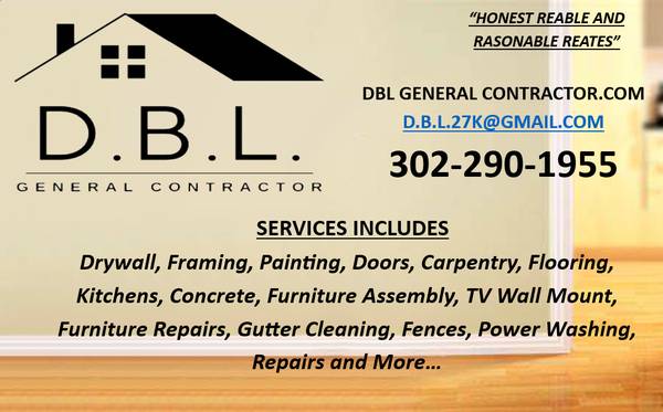Free Estimates! Call 302-290-1955 or 610-762-9431 or send an email to D.B.L.27k@gmail.com