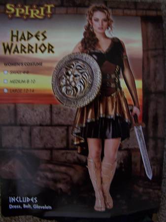 I have a HADES WARRIOR Halloween costume from SPIRIT for sale. Size: Large 12-14. Includes dress, belt, glovelets PLUS a shield with sword AND earrings. Materials: Polyester/Polyurethane and Non Leather. Excellent Condition. Still in original package.