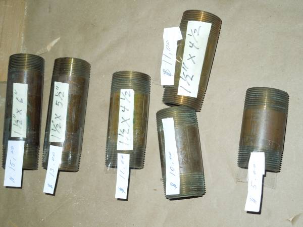 1 1/2 in Brass nipples for sale, at half price. 4 in for $10.oo - 4 1/2 in for $11.oo - 5 1/2 for $14.oo - 6 in for $15.oo. ( SEE PHOTOS )