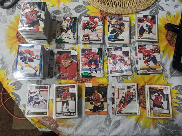 I have an AWESOME LOT of Philly Flyers cards from the 1990's INCLUDES ROOKIES / PROSPECTS / GOLD - Lindros - Hextall - Brindamour - Renberg - Jones - Snow - LeClair - Desjardins - Clarke - Primeau -...