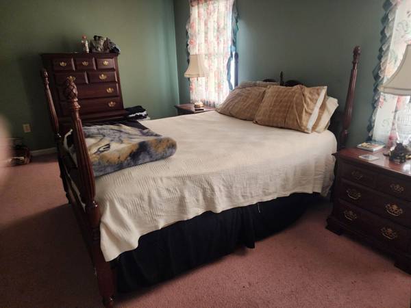 Queen size bedroom set in very good condition from a smoke-free and pet free home. Headboard, footboard, dresser, two night stands, queen mattress, and boxspring included.