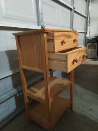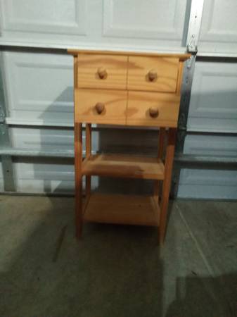 Reduced! Was $55... Now $45! Sturdy wooden (?pine) table with 2 functional drawers and 2 shelves. Unfinished, ready for paint, stain, or other application. Sturdy but not difficult to transport, will fit into car, SUV, etc.