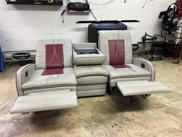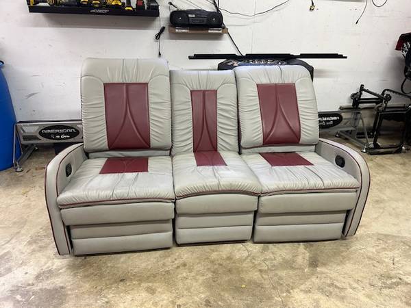 De Leon RV double reclining sofa, light gray leather, has fold-down center section with cup holders and a storage compartment under the center section. If you see this ad, it's available. LOCAL PICK...