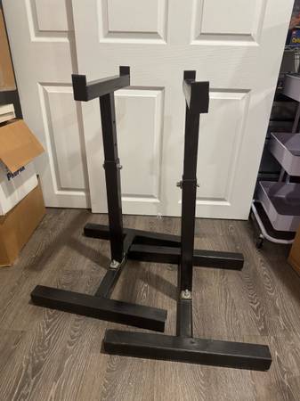 Set of two Adjustable steel freeweight barbell stands and milk crate of random plates. Buyer takes all. Seller moving sale and cannot separate.