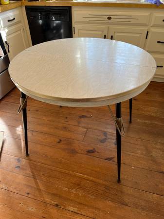 Throw back to the 50’s! White formica kitchen table that can be a circle or oval with the two leafs. Legs fold in for easy transport. $45.00.