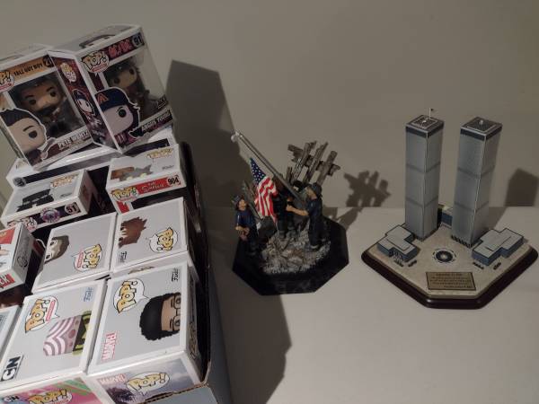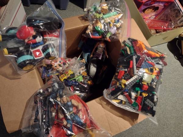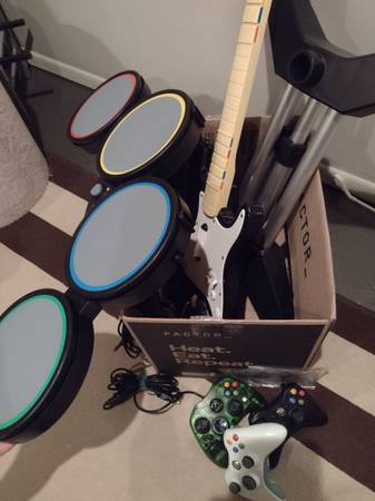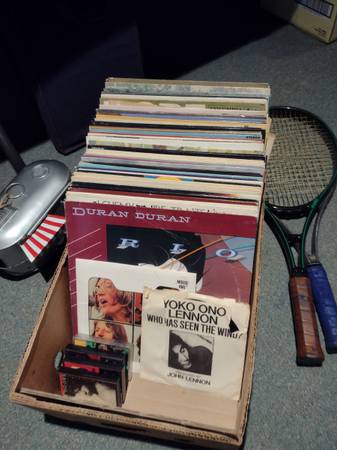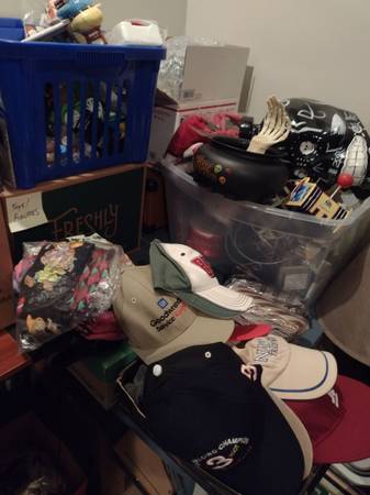 Electronics & Gaming: Retro video games (Nintendo, Xbox, PlayStation), controllers, DVDs, large Harley Davidson bike/remote, cameras, vinyl records albums, cassette tapes, and gadgets. Sports...