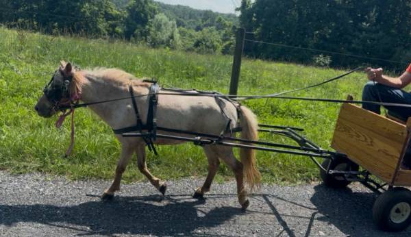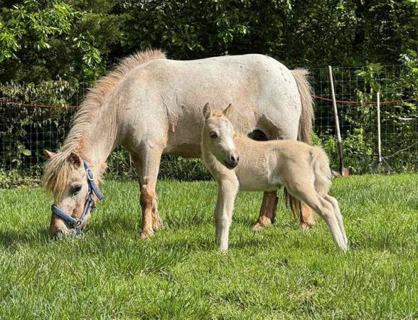 11 year old grade Appaloosa Mini horse mare. She’s 33” tall. Sweet and gentle. She is broke to ride and drive. She’s possibly in foal (pregnant) to a Smokey black stallion with blue eyes. She would be due around April 2026. She leads, loads in a trailer, stands for farrier, ties, bathes and clips. Shes handled and rode by my kids who are 4 and 6 years old and is great with them. Asking $2500. Videos available upon request. Delivery is also available for additional costs.