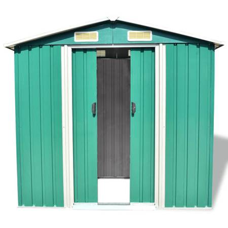 This large green metal garden storage shed is built to provide a sturdy and spacious solution for outdoor storage, perfect for those needing an efficient and stylish way to keep their gardening tools and lawn care gear organized. Its industrial-inspired design fits right into any backyard or garden while being super functional and tough enough to handle bad weather without sacrificing good looks.