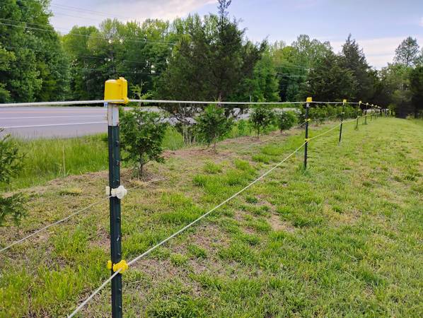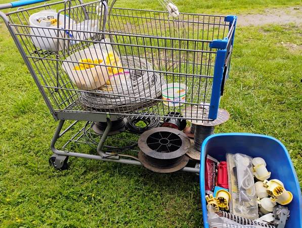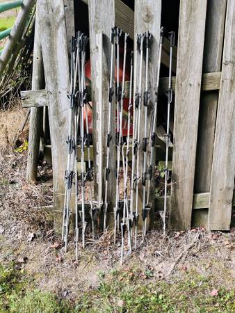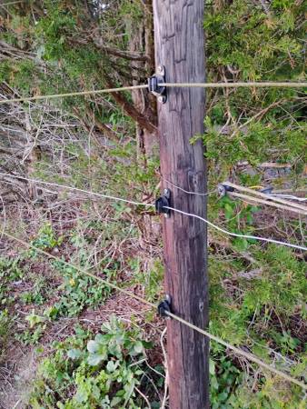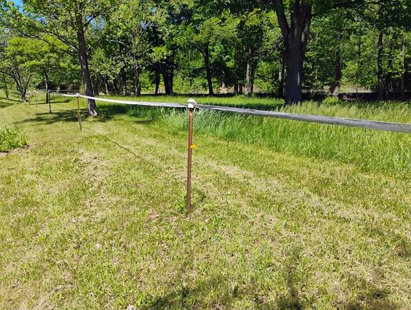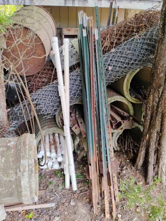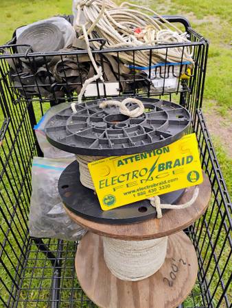 All materials needed to fence 5 acres of horse/cattle pasture. 1/3 to 1/2 price of new. 4800'-electrobraid poly wire, 1000'-2" poly elec. tape w/post cover mounts, 2400' bare wire, 105 T-posts, 30 step-in temporary posts, 4" wood posts, 550 wire attachment insulators. See all photos. Selling in large quantities of the total of materials only.