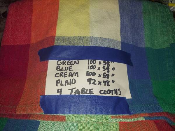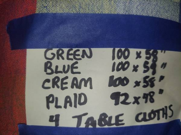 4 tablecloths. Sizes and colors in picture.