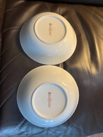 Meiwa China Christmas serving bowls, 9", gold trim, no chips or cracks. 2 available, $15 each. Gold Leaf paint smudge on back of one bowl.