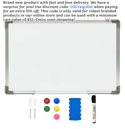 The whiteboard has a lacquer-coated steel surface which is easy to write and clean with the included marker and eraser. The aluminium frame and the corner protector make it sturdy and durable. You can hang the item with the included magnets. Hooks and nails are included for easy mounting to the wall.