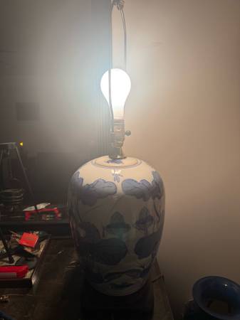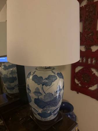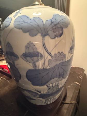 Beautiful blue and white hand-painted porcelain lamp featuring a classic lotus design and solid wooden base. In excellent condition with no chips or cracks. Includes a 3-way switch for adjustable lighting.