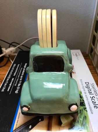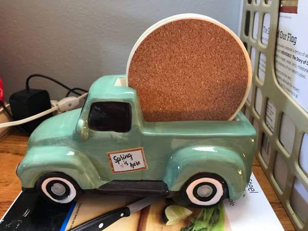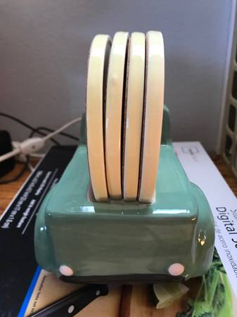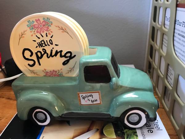 Ceramic Green Farm Truck Coaster Caddy Holds 4 Yellow "Hello Spring" Coasters Super cute! Very Good Condition Approximate Dimensions - 8 inches long, 6 inches high with coasters, 3-1/2 inches across...