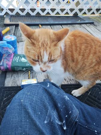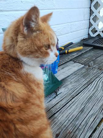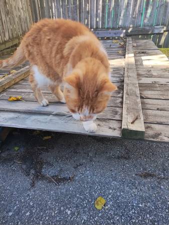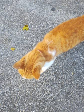 Orange cat . Friendly. Has a pink collar around neck. In my yard since Monday 11/3