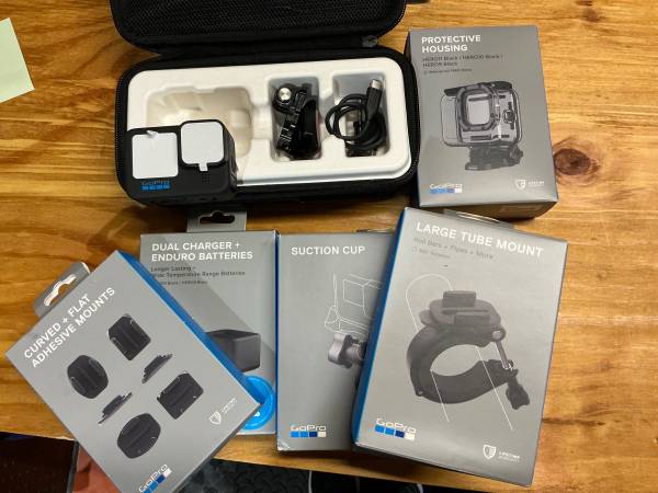 GoPro Hero 10 Black, New never used. Included: protective housing, suction cup, large tube mount, Curved & flat adhesive mounts, dual charger & enduro batteries. TEXT ONLY - CASH ONLY