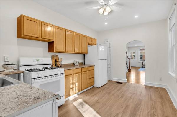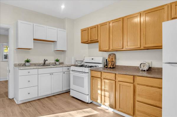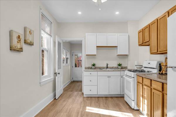 🍳 Updated kitchen with LVP flooring, oak & white cabinetry, and granite-look countertops