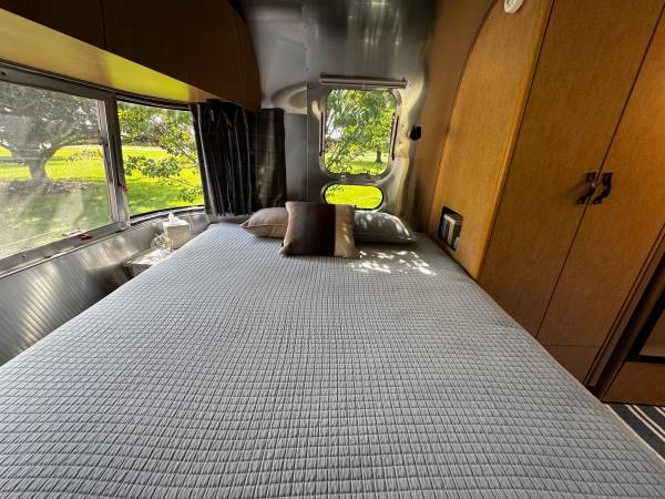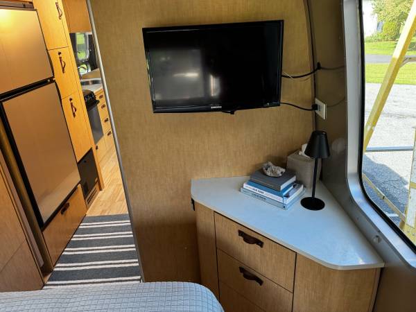 Unique floor plan that was only made for four years. This two owner coach has a huge u shaped dinette that will easily seat six people and converts down into a king bed sized sleeping area. The bathroom is complete on one side so you do not step out into the hallway from the shower or the lavatory. Rear bedroom with and east/west clipped queen bed is amazing when you back into the campsites with the view because of the wrap around windows. Plentiful storage both outside and inside the coach.