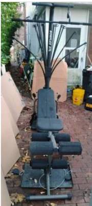 Bowflex Power Pro Home Gym. $99. A weight lifting machine that uses flexible tubes or bows for resistance instead of heavy, unwieldy weights. This is in very good condition, has the equivalent of 310 lbs. (inclues the 100 lb. upgrade) of resistance, leg extension & removable, adjustable seat & back support, on line owner's manual & fitness guide & lots more. It fits into a 21" by 24" space with bench folded up. The online manual has lots of pages with photos just detailing the wide range of exercises this device is designed for, categorized into chest, shoulder, back, arm exercises. There are numerous adjustments all over the machine to accommodate any size person, with any size limbs. A new Bowflex home gym goes for $700- $1599. It easily disassembles for transport in a small car or moving down stairs. Here is a video that aptly shows this model & a small number of its exercises, options & adjustments. https://www.youtube.com/watch?v=pQySiImZXpU Included are lat pull down bar AND hand pull downs, accessories, cables, hardware and more.