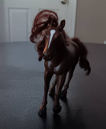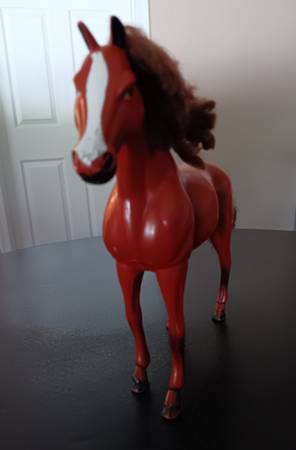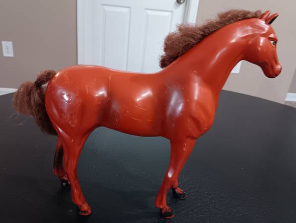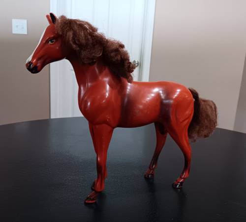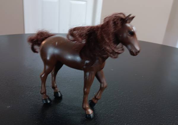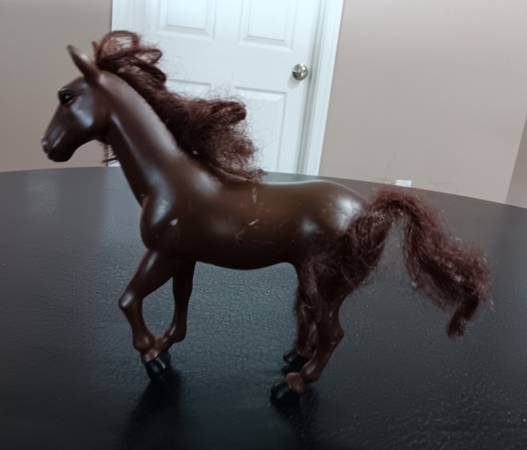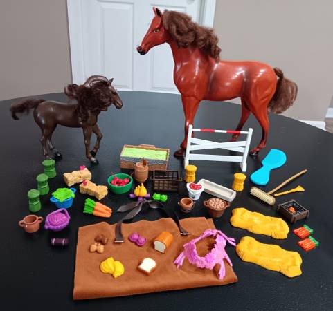 Two toy horses and 46 count accessories for $14.00. Large horse measures 11 1/4"H x 11 1/4"L (not counting the hair.). Medium dark brown horse measures 6 1/4"H x 6 1/4"L (not counting the hair). Comes from a clean and smoke-free home.