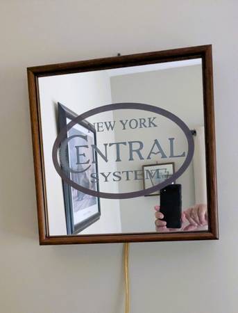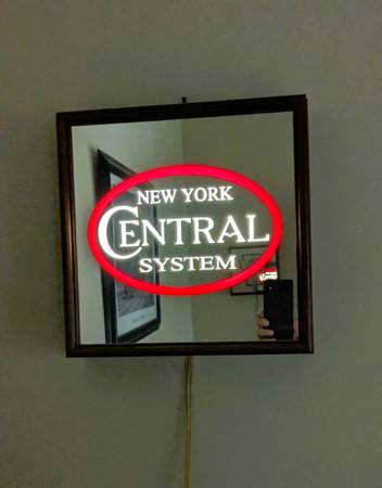 I have 1 unique backlit/ mirrored railroad logo sign with a beautiful wooden frame. It measure about 12 1/2 x 12 1/2, and can be hung or placed on a platform or stand. It has a lighted rocker switch It would go great in a train room setup .It's rare, the company is out of business. The sign is the New York Central.