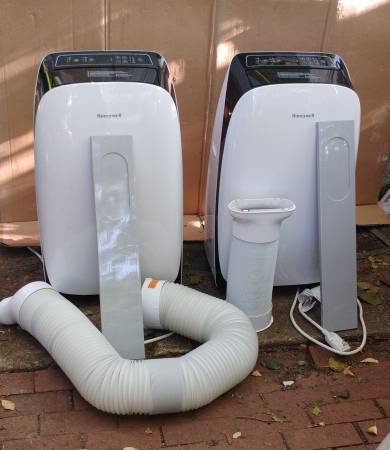 2 Portable Air Conditioners, 10,000 BTU, for big rooms, up to 450sq. ft. Both are Honeywell models HL10CESWW, include telescoping flexible hose and window venting kit. They have a dehumidifier feature, 3 speed fans and work very well. Give out strong blast of cold air. And they roll easily on 4 casters. They look very good also. Any 10 K BTU portable AC new would be well over $200, PLUS TAX. I am asking just $89 for one or $169 for both to sell fast. They measure about 31 in. high x 17 in. wide x 11.5 in. deep.