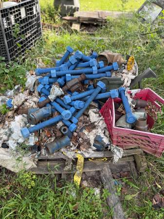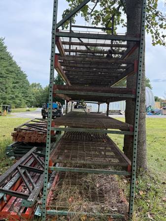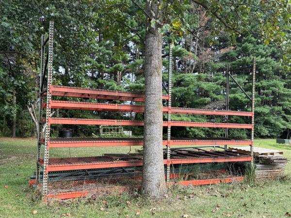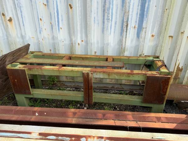 Various items range from pallet racking/shelving, welder, forks to fork lift/new, 2” water pipe/good for conduit, flanges, gang boxes, generator, 500 gallon fuel tank, I beams, , metal base for fab table, galvanized shutters, cover to ‘72 gmc Jimmy, tephlon coated bolts/nuts, plus more.